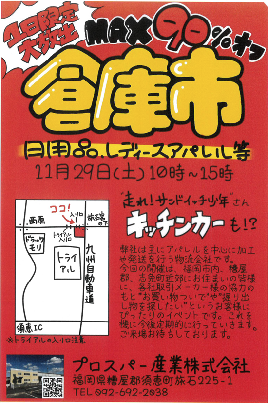 ■ 開催場所:福岡県糟屋郡須恵町旅石 プロスパー産業 倉庫内(トライアル須恵店横)